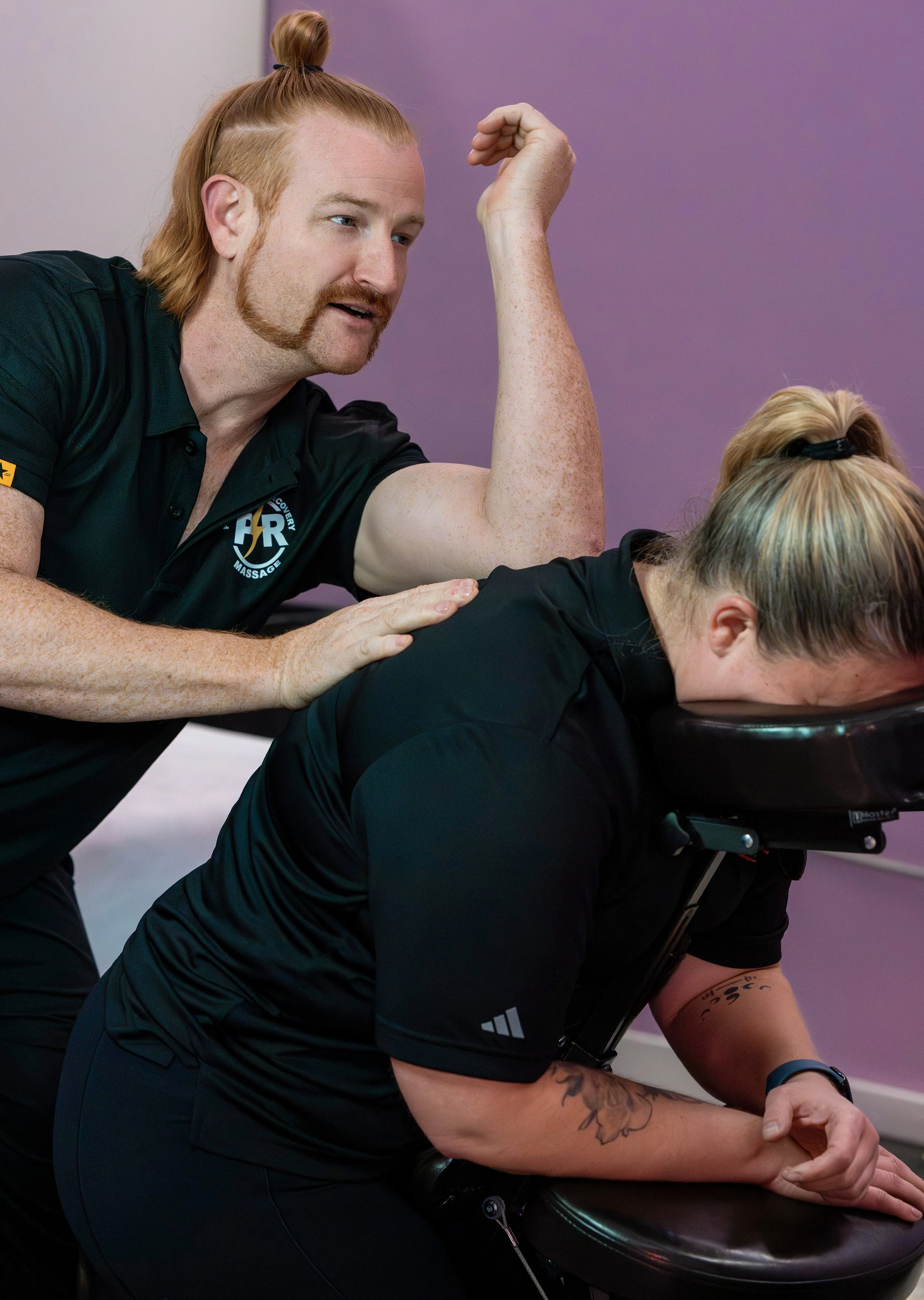 This session is performed with the client seated in a specialized massage chair while remaining fully clothed (loose, comfortable attire is recommended). Focus areas include the neck, scalp, shoulders, back, and forearms. Chair massage is an effective option for reducing muscle tension, improving circulation, and addressing minor neck and shoulder discomfort.